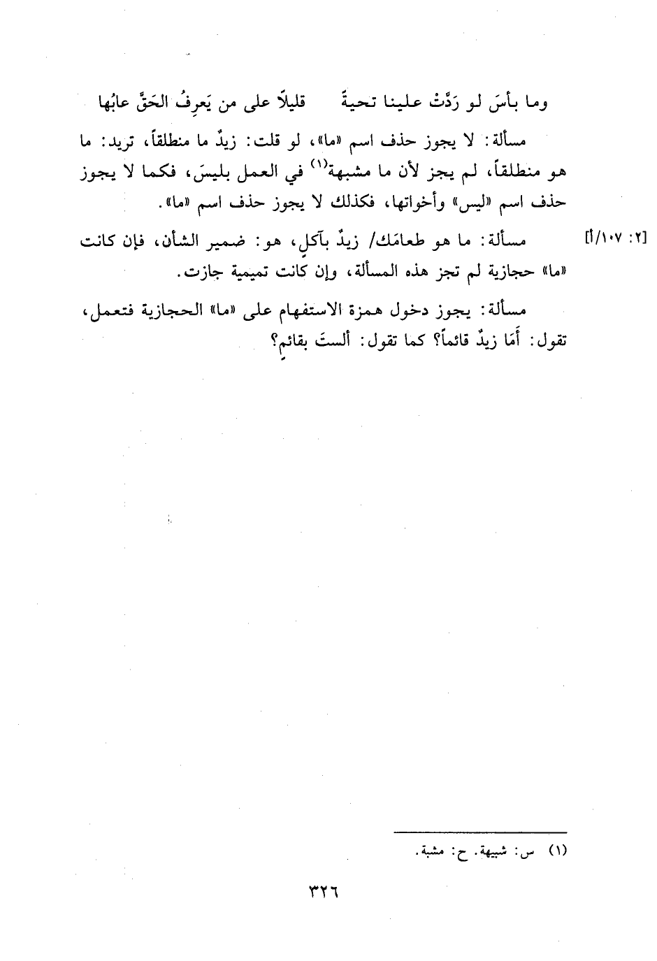 مسألة: لا يجوز حذف اسم "ما"، لو قلت: زيد ما منطلقًا، تريد: ما هو منطلقًا، لم يجز لأن ما مشبهة في العمل بليس، فكما لا يجوز حذف اسم "ليس" وأخواتها، فكذلك لا يجوز حذف اسم "ما".