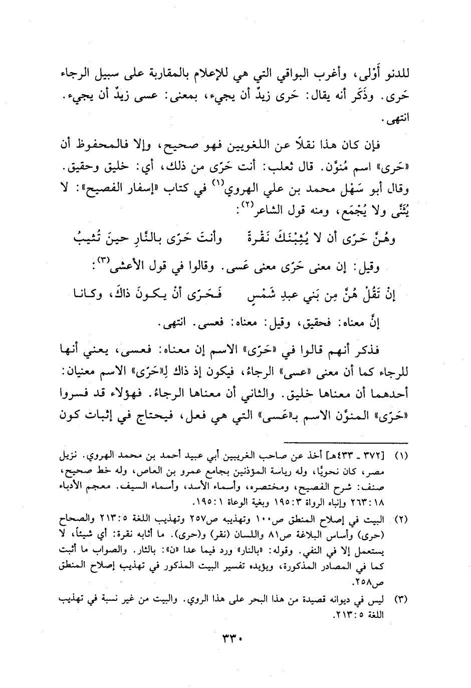 فذكر أنهم قالوا في "حري" الاسم إن معناه: فعسى، يعني أنها للرجاء كما أن معنى "عسى" الرجاء، فيكون إذ ذاك ل"حري" الاسم معنيان: أحدهما أن معناها خليق. والثاني أن معناها الرجاء. فهؤلاء قد فسروا "حري" المنون الاسم ب"عسى" التي هي فعل، فيحتاج في إثبات كون