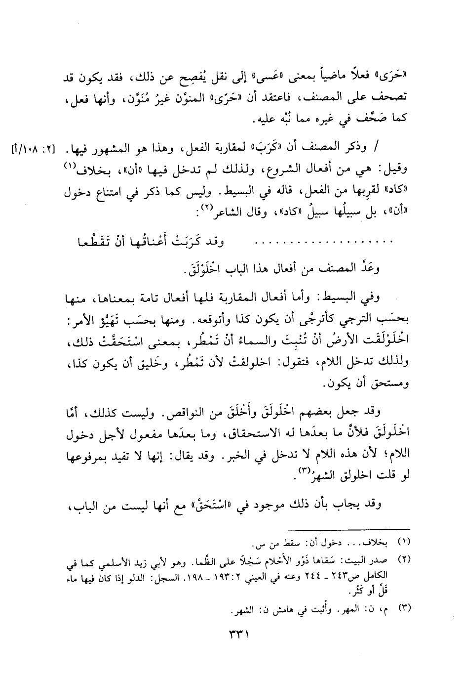 وقد جعل بعضهم اخلولق وأخلق من النواقص. وليس كذلك، أما اخلولق فلأن ما بعدها له الاستحقاق، وما بعدها مفعول لأجل دخول اللام؛ لأن هذه اللام لا تدخل في الخبر. وقد يقال: إنها لا تفيد بمرفوعها لو قلت اخلولق الشهر.