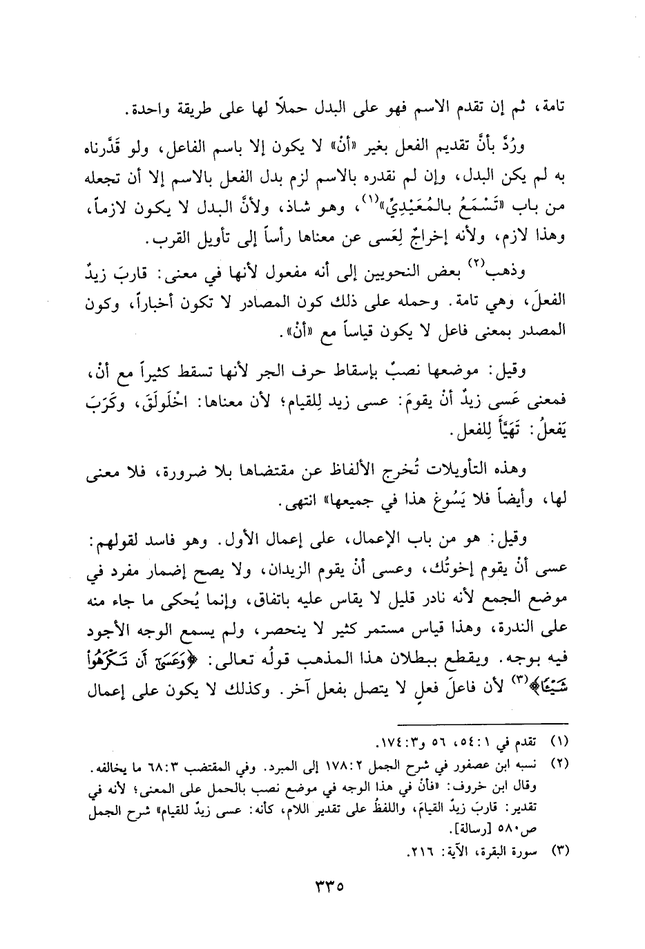 ورد بأن تقديم الفعل يغير "أن" لا يكون إلا باسم الفاعل، ولو قدرناه به لم يكن البدل، وإن لم نقدره بالاسم لزن بدل الفعل بالاسم إلا أن تجعله من باب "تسمع بالمعيدي"، وهو شاذ، ولأن البدل لا يكون لازمًا، وهذا لازم، ولأنه إخراج لعسى عن معناها رأسًا إلى تأويل القرب.
