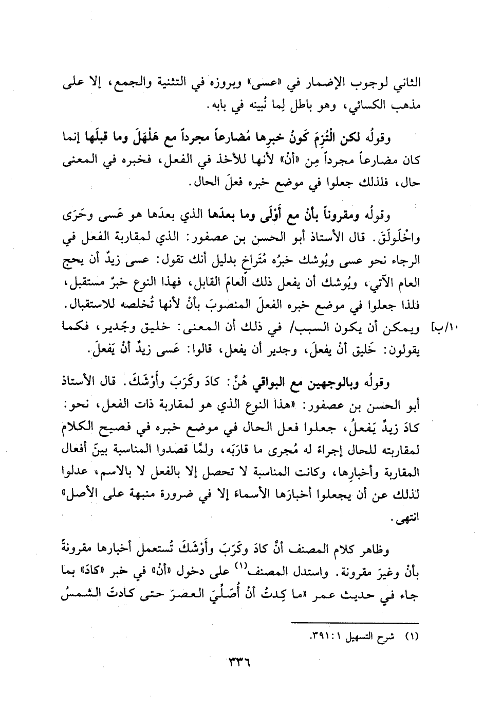 وقوله بالوجهين مع البواقي هن: كاد وكرب وأوشك. قال الأستاذ أبو الحسن بن عصفور: "هذا النوع الذي هو لمقاربة ذات الفعل، نحو: كاد زيد يفعل، جعلوا فعل الحال في موضع خبره في فصيح الكلام لمقاربته للحال إجراء له مجرى ما قاربه، ولما قصدوا المناسبة بين الأفعال المقاربة وأخبارها، وكانت المناسبة لا تحصل إلا بالفعل لا بالاسم، عدلوا لذلك عن أن يجعلوا أخبارها الأسماء إلا في ضرورة منبهة على الأصل" انتهى.