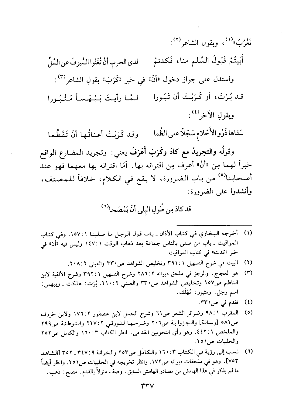 وقوله والتجريد مع كاد وكرب أعرف يعني: وتجريد المضارع الواقع خبرًا لهما من "أن" أعرف من اقترانه بها. أما اقترانه بها معهما فهو عند أصحابنا من باب الضرورة، لا يقع في الكلام، خلافًا للمصنف، وأنشدوا على الضرورة: