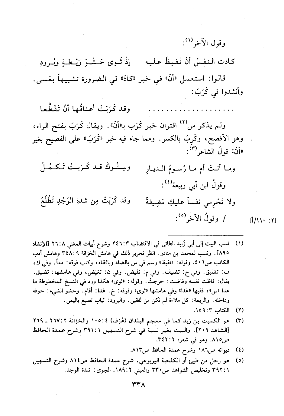 ولم يذكر س اقتران خبر كرب ب"أن". ويقال كرب بفتح الراء، وهو الأفصح، وكرب بالكسر. ومما جاء فيه خبر "كرب" على الفصيح بغير "أن" قول الشاعر: