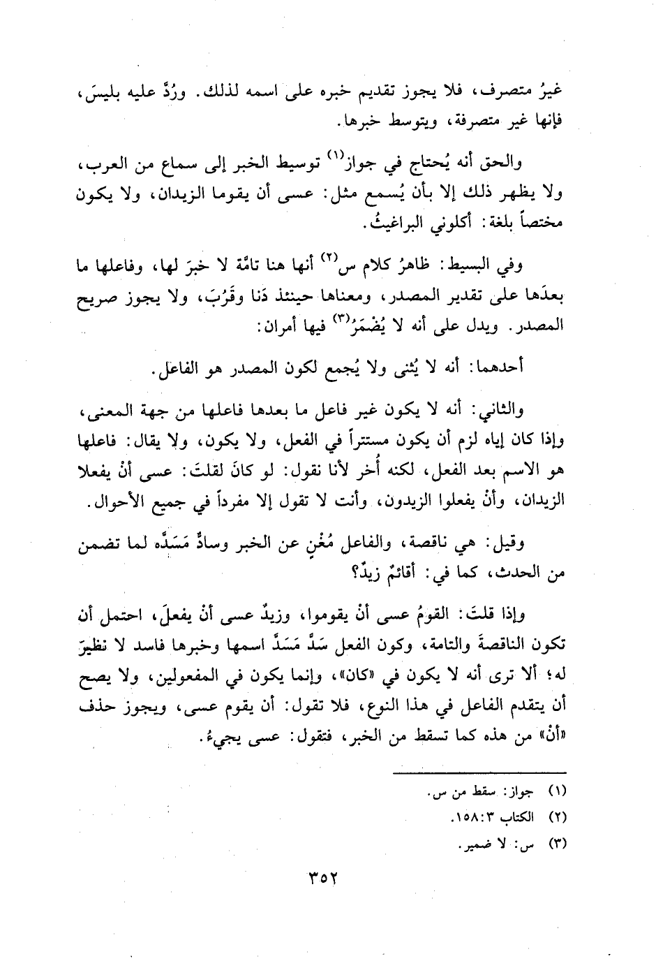 وإذا قلت: القوم عسى أن يقوموا، وعسى أن يفعل، احتمل أن تكون الناقصة والتامة، وكون الفعل سد مسد اسمها وخبرها فاسد لا نظير له؛ ألا ترى أنه لا يكون في "كان"، وإنما يكون في المفعولين، ولا يصح أن يتقدم الفاعل في هذا النوع، فلا تقول: أن يقوم عسى، ويجوز حذف "أن" من هذه كما تسقط من الخبر، فتقول: عسى يجيء.