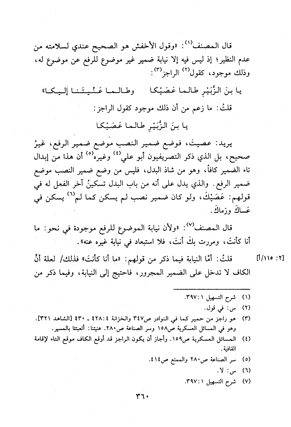 يريد: عصيت، فوضع ضمير النصب مرفوع ضمير الرفع، غير صحيح، بل الذي ذكر التصريفيون أبو علي وغيره أن هذا من إبدال تاء الضمير كافًا، وهو من شاذ البدل، فليس من وضع ضمير النصب موضع ضمير الرفع. والذي يدل على أنه من باب البدل تسكين آخر الفعل له في قولهم: عصيك، ولو كان ضمير نصب لم يسكن كما لم يسكن عساك روماك.