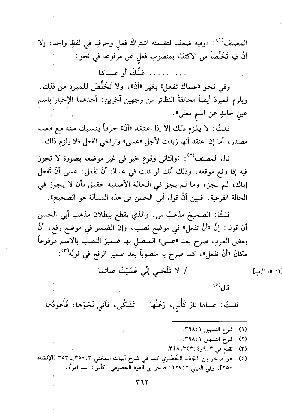 وفي نحو "عساك تفعل" بغير "أن"، ولا تخلص للمبرد من ذلك. ويلزم المبرد أيضًا مخالفة النظائر من وجهين آخرين: أحدهما الإخبار باسم عين جامد عن اسم معنى".