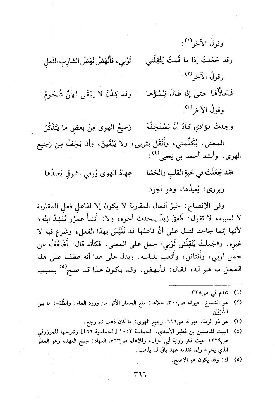 وفي الإفصاح: خبر أفعال المقاربة لا يكون إلا لفاعل فعل المقاربة لا لسببه، لا تقول: طفق زيد يتحدث أخوه، ولا: أنشأ عمرو ينشد ابنه؛ لأنها إنما جاءت لتدل على أن فاعلها قد تلبس بهذا الفعل، وشرع فيه لا غيره. و"جعلت يثقلني ثوبي" حمل على المعنى، فكأنه قال: أضعف عن حمل ثوبي، وأتثاقل، وأتعب بلباسه. ويدل على هذا أنه عطف على هذا الفعل ما هو له، فقال: فأنهض. وقد يكون هذا قد صح بسبب