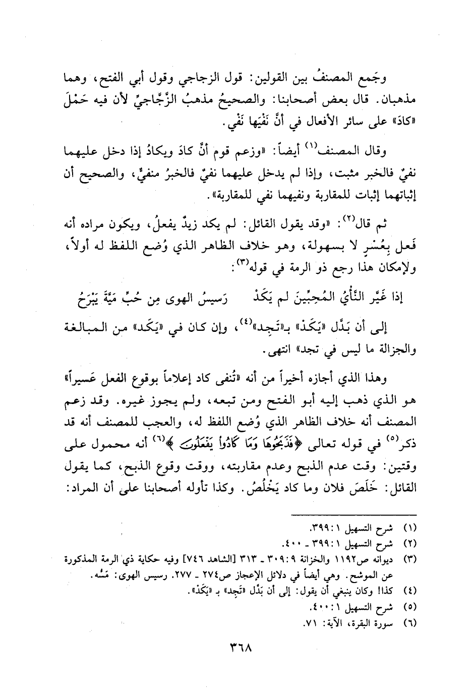 وهذا الذي أجازه أخيرًا من انه "تنفي كاد إعلامًا بوقوع الفعل عسيرًا" هو الذي ذهب إليه أبو الفتح ومن تبعه، ولم يجوز غيره. وقد زعم المصنف أنه خلاف الظاهر الذي وضع اللفظ له، والعجب أنه قد ذكر في قوله تعالى {فَذَبَحُوهَا وَمَا كَادُوا يَفْعَلُونَ} أنه محمول على وقتين: وقت عدم الذبح وعدم مقاربته، ووقت وقوع الذبح، كما يقول القائل: خلص فلان وما كاد يخلص. وكذا تأوله أصحابنا على أن المراد: