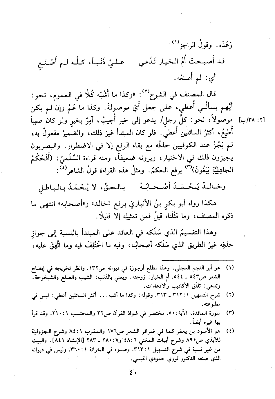 قال المصنف في الشرح: "وكذا ما أشبه كلًا في العموم، نحو: أيهم يسألني أعطي، على جعل أي موصولة. وكذا ما عم وإن لم يكن موصولًا، نحو: كل رجل/ يدعو إلى خير أجيب، آمر بخير ولو كان صبيًا أطيع، أكثر السائلين أعطي. فول كان المبتدأ غير ذلك، والضمير مفعول به، لم يجز عند الكوفيين حذفه مع بقاء الرفع إلا في الاضطرار. والبصريون يجيزون ذلك في الاختيار، ويرونه ضعيفًا، ومنه قراءة السلمي: (أفحكم الجاهلية يبغون) برفع الحكم. ومثل هذا القراءة قول الشاعر: