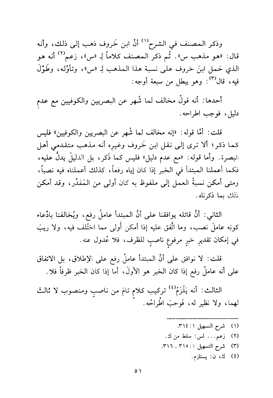 وذكر المصنف في الشرح أن ابن خروف ذهب إلى ذلك، وأنه قال: "هو مذهب س". ثم ذكر المصنف كلامًا لـ"س"، زعم أنه هو الذي حمل ابن خروف على نسبة هذا المذهب لـ"س"، وتأوله، وطول فيه، قال: وهو يبطل من سبعة أوجه: