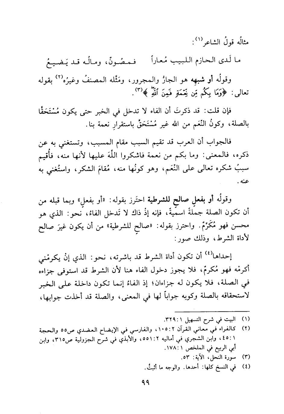 وقوله أو بفعل صالح للشرطية احترز بقوله "أو بفعل" وبما قبله من أن تكون الصلة جملة اسمية، فإنه إذ ذاك لا تدخل الفاء، نحو: الذي هو محسن فهو مكرم. واحترز بقوله: "صالح للشرطية" من أن يكون غير صالح لأداء الشرط، وذلك صور: