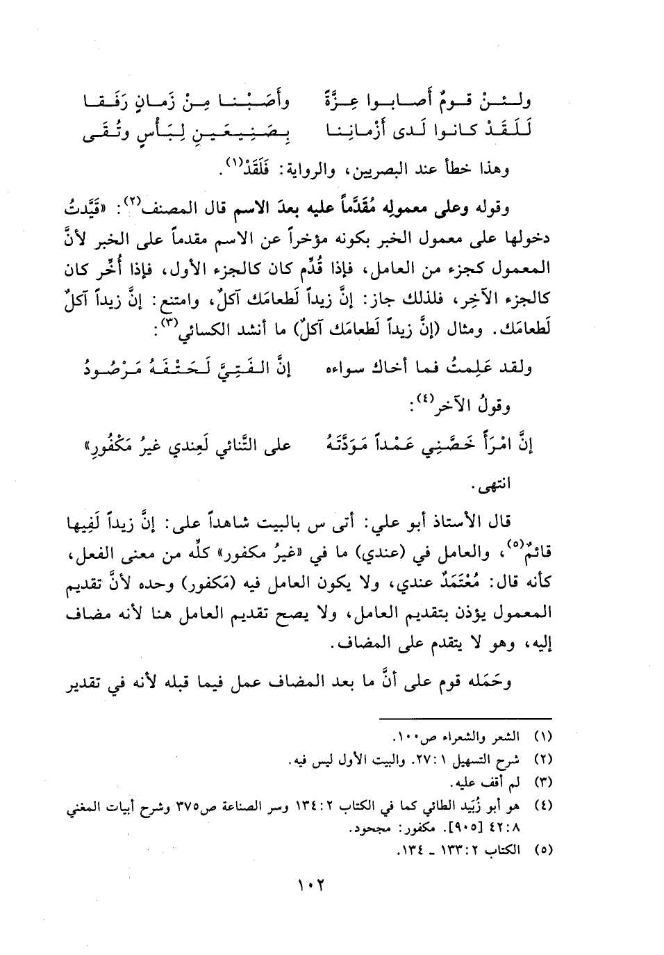 قال الأستاذ أبو علي: أتى س بالبيت شاهداً على: إن زيداً لفيها قائم، والعامل في (عندي) ما في "غير مكفور" كله من معنى الفعل، كأنه قال: معتمد عندي، ولا يكون العامل فيه (مكفور) وحده لأن تقديم المعمول يؤذن بتقديم العامل، ولا يصح تقديم العامل هنا لأنه مضاف إليه، وهو لا يتقدم على المضاف.