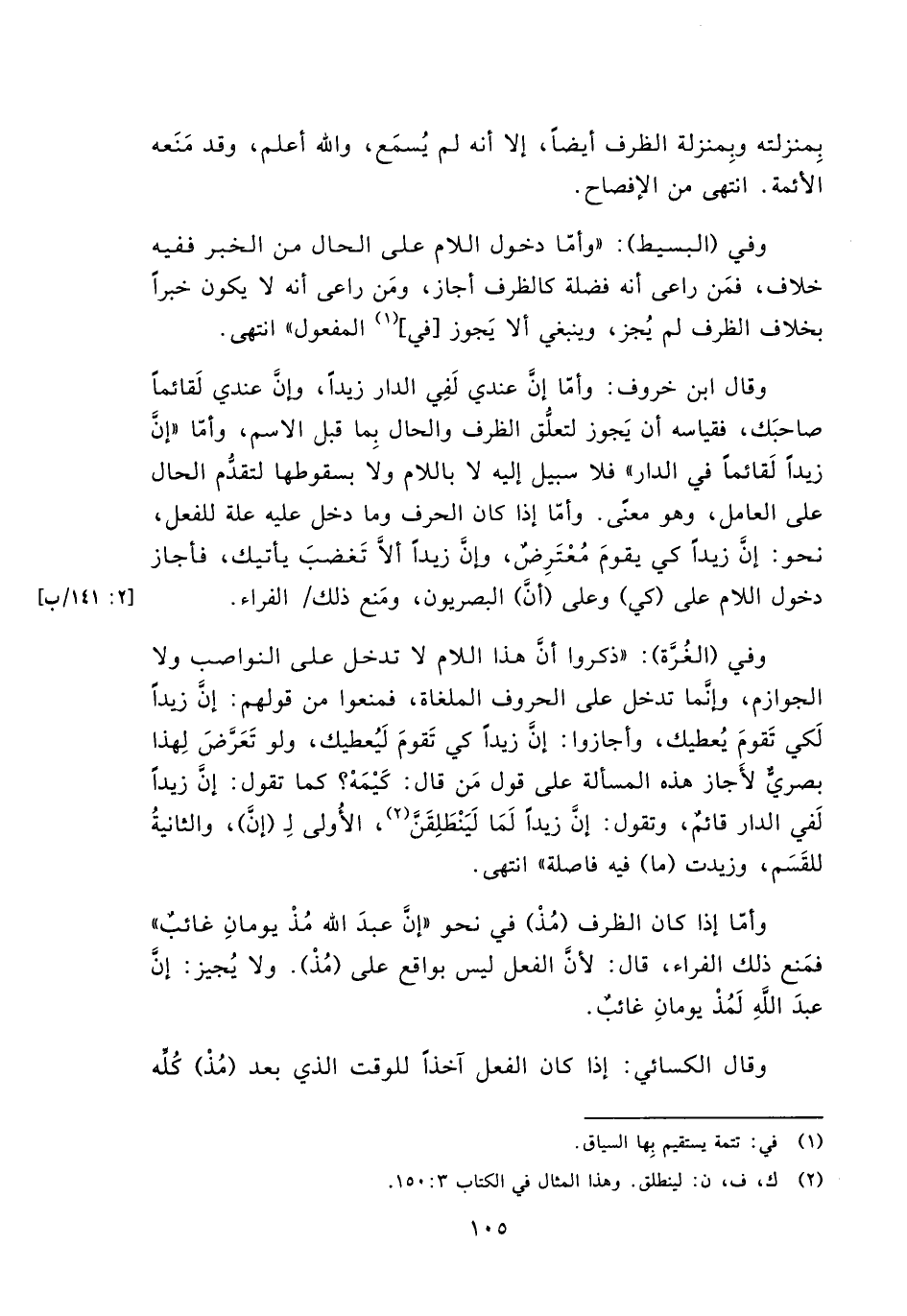 وفي (البسيط): "وأما دخول اللام على الحال من الخبر ففيه خلاف، فمن راعى أنه فضلة كالظرف أجاز، ومن راعى أنه لا يكون خبراً بخلاف الظرف لم يجز، وينبغي ألا يجوز [في] المفعول " انتهى.