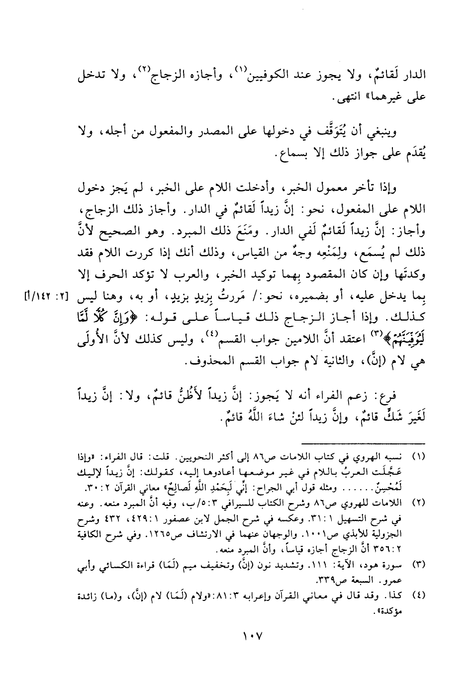 وإذا تأخر معمول الخبر، وأدخلت اللام على الخبر، لم يجز دخول اللام على المفعول، نحو: إن زيداّ لقائم في الدار. وأجاز ذلك الزجاج، وأجاز: أن زيداً لقائم لفي الدار. ومنع ذلك المبرد. وهو الصحيح لأن ذلك لم يسمع، ولمنعه وجه من القياس، وذلك أنك إذا كررت اللام فقد وكدتها وإن كان المقصود بهما توكيد الخبر، والعرب لا تؤكد الحرف إلا بما يدخل عليه، أو بضميره، نحو: / مررت بزيد، أو به، وهنا ليس كذلك. وإذا أجاز الزجاج ذلك قياساً على قوله: {وَإِنَّ كُلاًّ لَّمَّا لَيُوَفِّيَنَّهُمْ} اعتقد أن اللامين جواب القسم، وليس كذلك لأن الأولى هي لام (إن)، والثانية لام جواب القسم المحذوف.