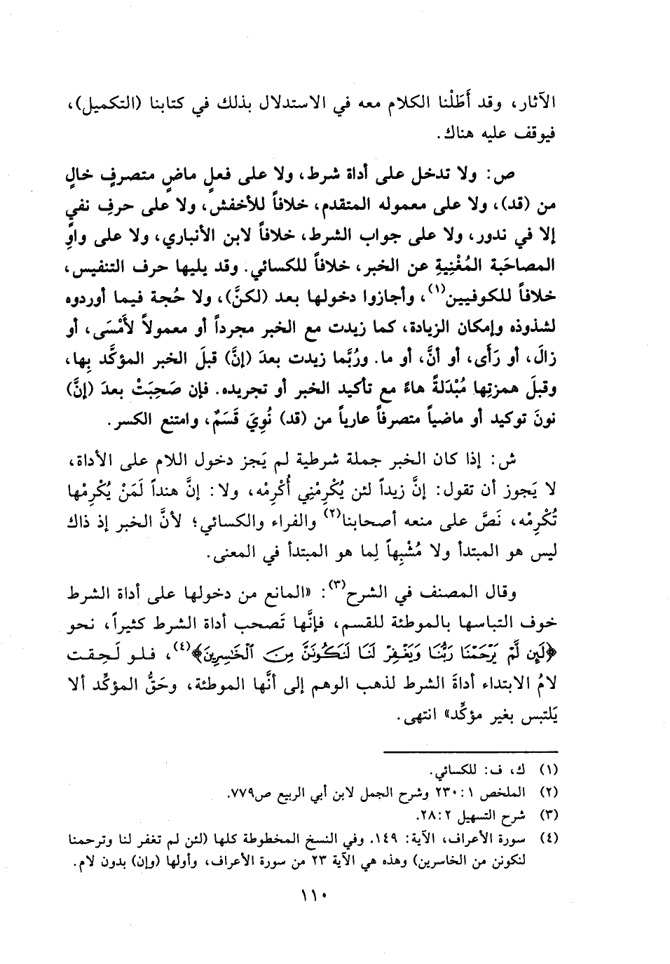 وقال المصنف في الشرح: "المانع من دخولها على أداة الشرط خوف التباسها بالموطئة للقسم، لأنها تصحب أداة الشرط كثيراً، نحو {لَئِن لَّمْ يَرْحَمْنَا رَبُّنَا وَيَغْفِرْ لَنَا لَنَكُونَنَّ مِنَ الْخَاسِرِينَ}، فلو لحقت لام الابتداء أداة الشرط لذهب الوهم إلى أنها الموطئة، وحق المؤكد ألا يلتبس بغير مؤكد" انتهى.