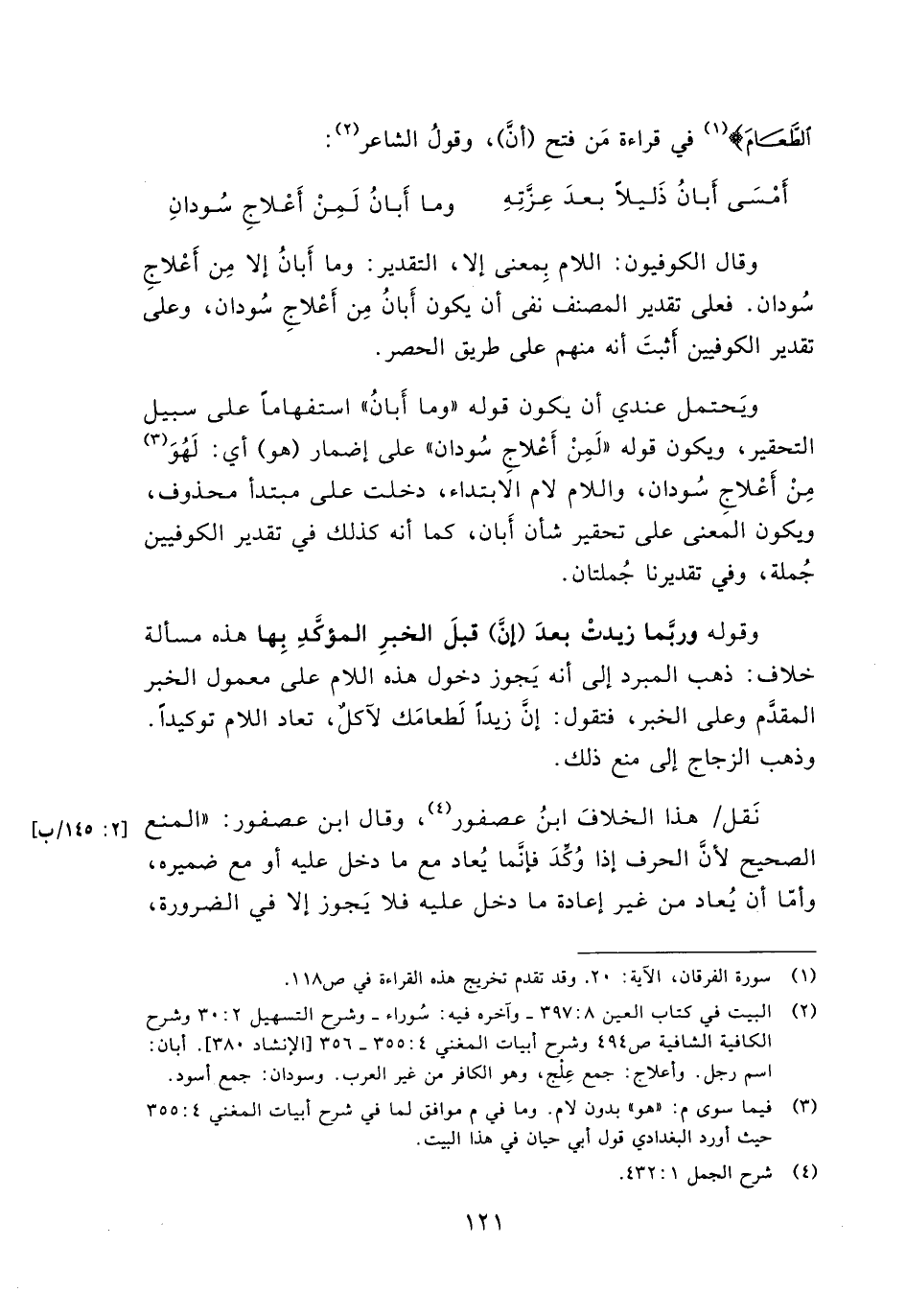 ويَتحمل عندي أن يكون قوله (وما أَبانُ) استفهاماً على سبيل التحقير، ويكون قوله (لَمِنْ أَعلاجِ سُودان) على إضمار (هو) أي: لَهُوَ مِنْ أَعلاجِ سُودان، واللام لام الابتداء، دخلت على مبتدأ محذوف، ويكون المعنى على تحقير شأن أَبان، كما أنه كذلك في تقدير الكوفيين جُملة، وفي تقديرنا جُملتان.