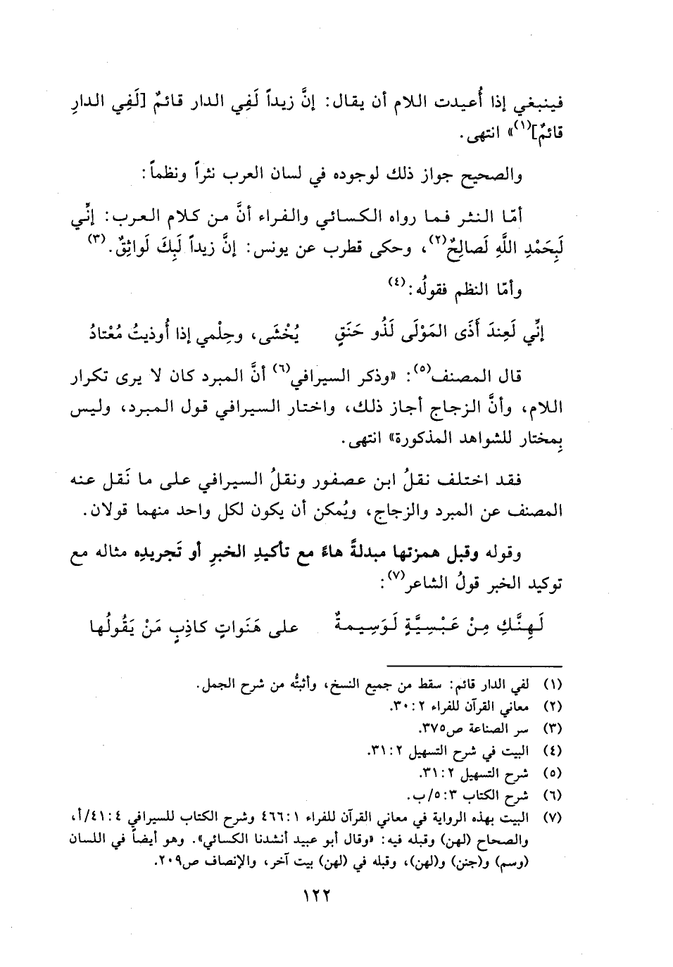 قال المصنف: (وذكر السيرافي أنَّ المبرد كان لا يرى تكرار اللام، وأنَّ الزجاج أجاز ذلك، واختار السيرافي قول المبرد، وليس بِمختار للشواهد المذكورة) انتهى.