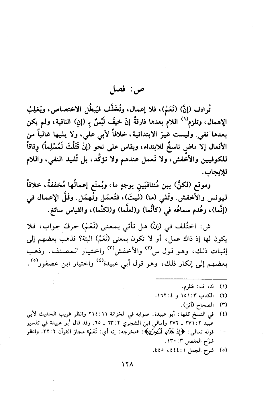 تُرادف (إنَّ) (نَعَمْ)، فلا إعمال، وتُخَفَّف فَيبطل الاختصاص، ويَغلِبُ الإهمال، وتلتزم اللام بعدها فارقةً إنْ خيفَ لَبْسٌ ب (إنِ) النافية، ولم يكن بعدها نفي. وليست غيرَ الابتدائية، خلافاً لأبي علي، ولا يليها غالباً من الأفعال إلا ماضٍ ناسخٌ للابتداء، ويقاس على نحو (إنْ قَتَلْتَ لَمُسْلِماً) وفاقاً للكوفيين والأخفش، ولا تَعمل عندهم ولا تؤكَّد، بل تُفيد النفي، واللام للإيجاب.
