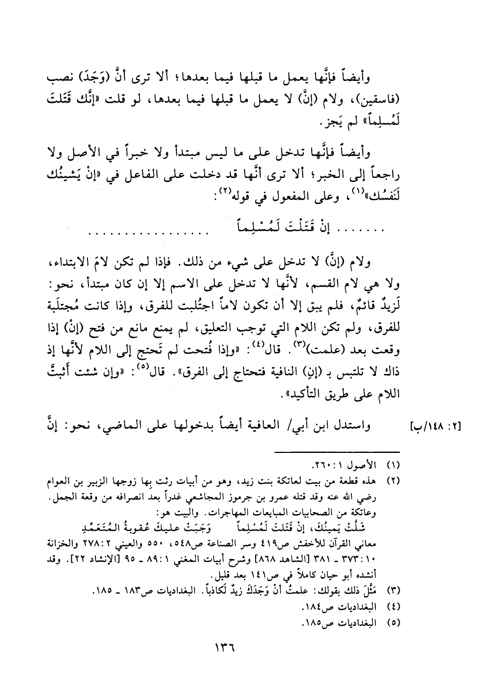 وأيضاً فإنَّها يعمل ما قبلها فيما بعدها؛ ألا ترى أنَّ (وَجَدَ) نصب (فاسقين) , ولام (إنَّ) لا يعمل ما قبلها فيما بعدها, لو قلت"إنَّك قَتَلتَ لَمُسلِماً"لم يَجز.