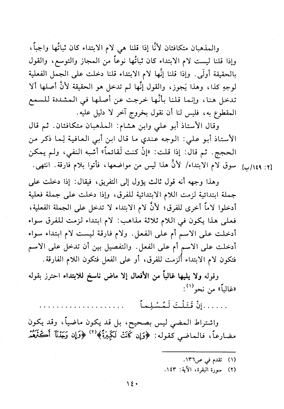 والمذهبان متكافئان لأنَّا إذا قلنا هي لام الابتداء كان ثباتُها واجباً. وإذا قلنا ليست لام الابتداء كان ثباتُها نوعا من المجاز والتوسع. والقول بالحقيقة أولىَ. وإذا قلنا إنَّها لام الابتداء قلنا دخلت علي الجمل الفعلية لوجهِ كذا, وهذا يَجوز. والقول إنَّها لم تدخل هو الحقيقة لأنَّ أصلها ألا تدخل هنا, وإنما قلنا بأنَّها خرجت عن أصلها في المشددة للسمع المقطوع به, فليس لنا أن نقول بخروج آخر لا دليل علية.