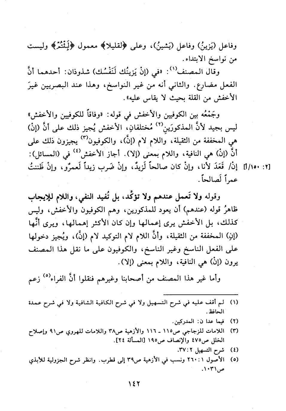 وقال المصنف: ((في (إن يزينك لنفسك) شذوذان: أحدهما أن الفعل مضارع. والثاني أنه من غير النواسخ, وهذا عند البصريين غير الأخفش من القلة بحيث لا يقاس عليه)).