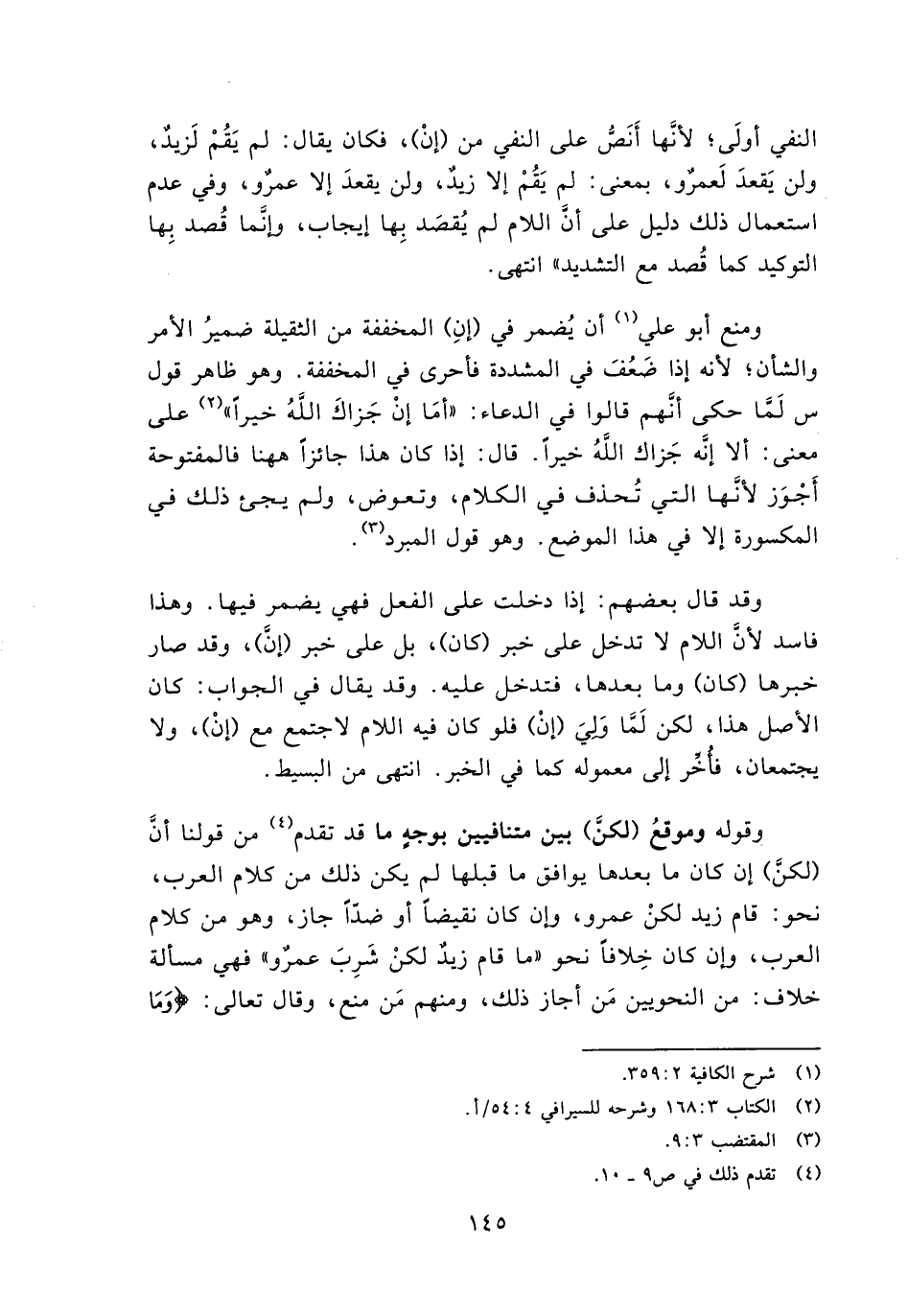 ومنع أبو علي أن يضمر في (إن) المخففة من الثقيلة ضمير الأمر والشأن؛ لأنه إذا ضعف في المشددة فأحرى في المخففة. وهو ظاهر قول س لما حكي أنهم قالوا في الدعاء: ((أما إن جزاك الله خيرا)) علي معني: ألا إنه جزاك الله خيرا. قال: إذا كان هذا جائزا ههنا فالمفتوحة أجوز لأنها التي تحذف في الكلام, وتعوض, ولم يجئ ذلك في المكسورة إلا في هذا الموضع. وهو قول المبرد.