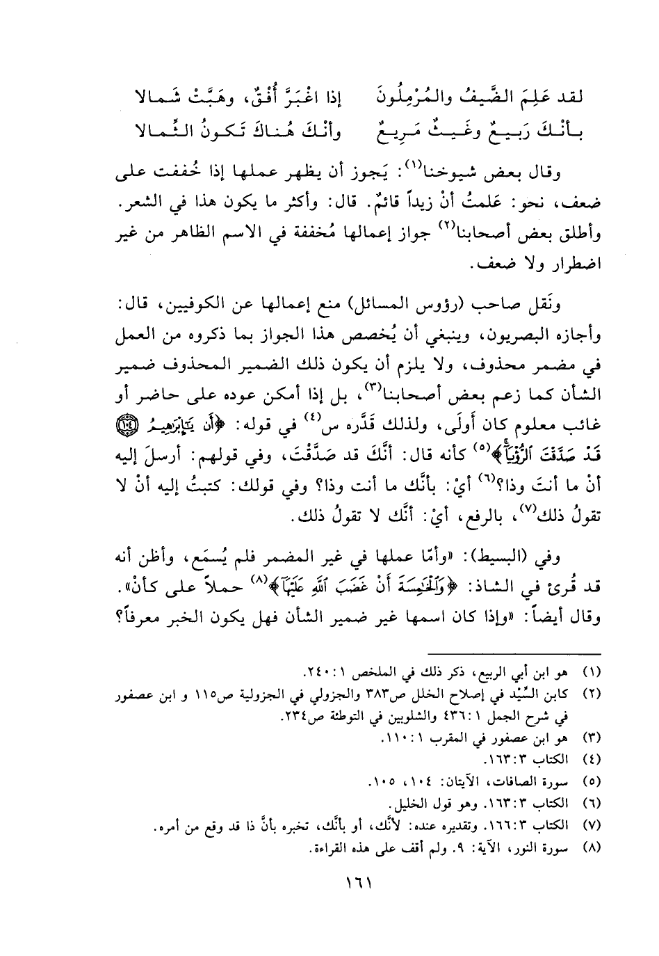 وفي (البسيط): "وأما عملها في غير المضمر فلم يسمع, وأظن أنه قد قرئ في الشاذ:} وَالْخَامِسَةَ أَنَّ غَضَبَ اللَّهِ عَلَيْهَا} حملًا على كأن", وقال أيضًا: "وإذا كان اسمها غير ضمير الشأن فهل يكون الخبر معرفًا؟