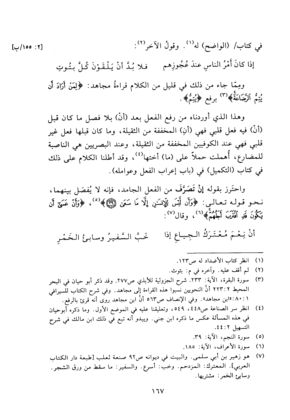 ومما جاء من ذلك في قليل من الكلام قراءة مجاهد:} لِمَنْ أَرَادَ أَن يُتِمَّ الرَّضَاعَةَ} برفع} يُتِمُّ {.