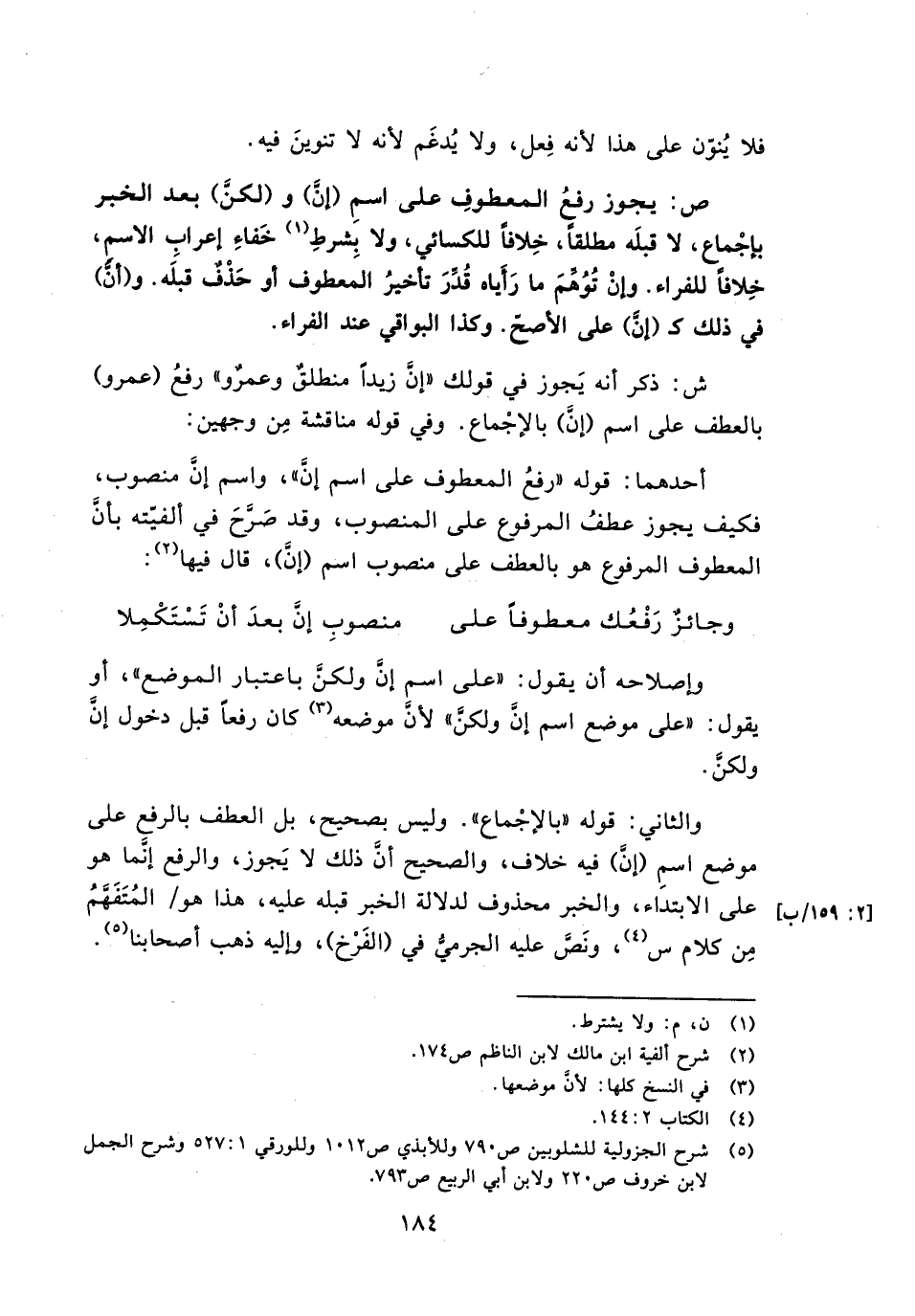 والثاني: قوله "بالإجماع", وليس بصحيح, بل العطف بالرفع على موضع اسم (إن) فيه خلاف, والصحيح أن ذلك لا يجوز, والرفع إنما هو على الابتداء, والخبر محذوف لدلالة الخبر قبله عليه, هذا هو المتفهم من كلام س, ونص عليه الجرمي في (الفرخ) , وإليه ذهب أصحابنا.