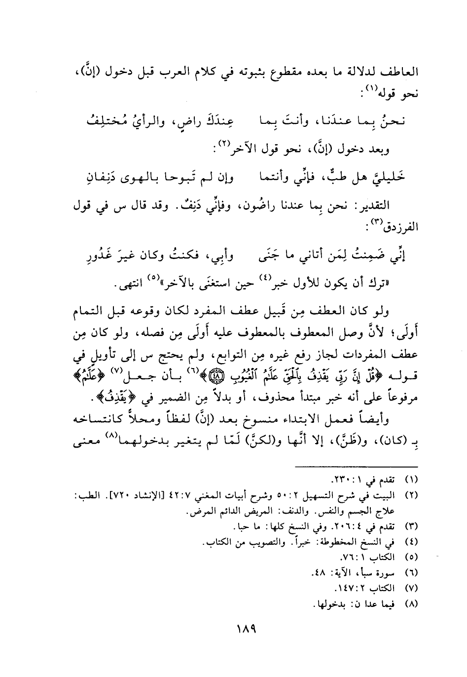 ولو كان العطف من قبيل عطف المفرد لكان وقوعه قبل التمام أولى؛ لأن وصل المعطوف بالمعطوف عليه أولى من فصله, ولو كان من عطف المفردات لجاز رفع غيره من التوابع, ولم يحتج س إلى تأويل في قوله {قُلْ إِنَّ رَبِّي يَقْذِفُ بِالْحَقِّ عَلَّامُ الْغُيُوبِ} بأن جعل {عَلَّامُ} مرفوعًا على أنه خبر مبتدأ محذوف, أو بدلًا من الضمير في {يَقْذِفُ}.