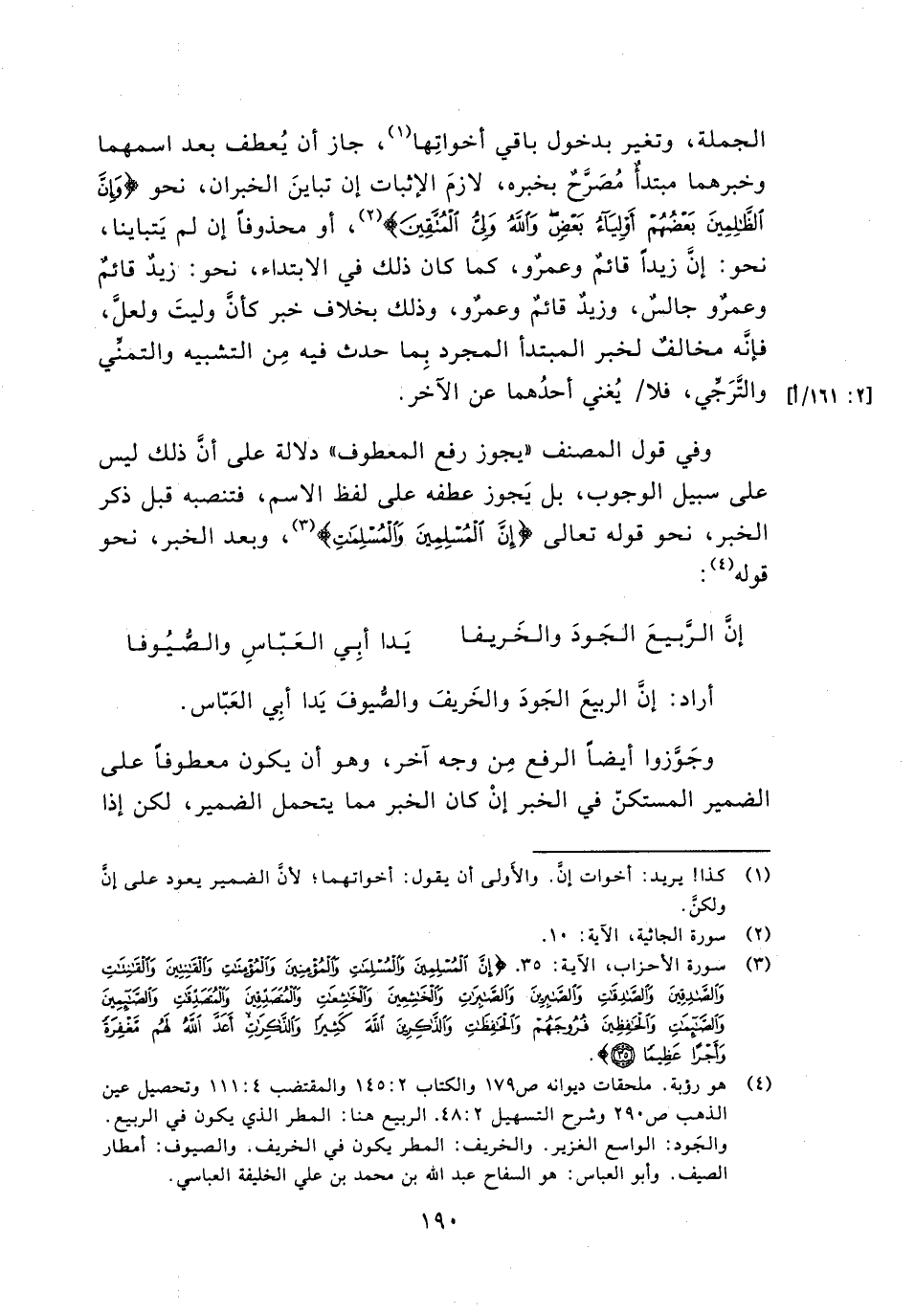 وفي قول المصنف "يجوز رفع المعطوف" دلالة على أن ذلك ليس على سبيل الوجوب, بل يجوز عطفه على لفظ الاسم, فتنصبه قبل ذكر الخبر, نحو قوله تعالى {إِنَّ الْمُسْلِمِينَ وَالْمُسْلِمَاتِ} , وبعد الخبر, نحو قوله: