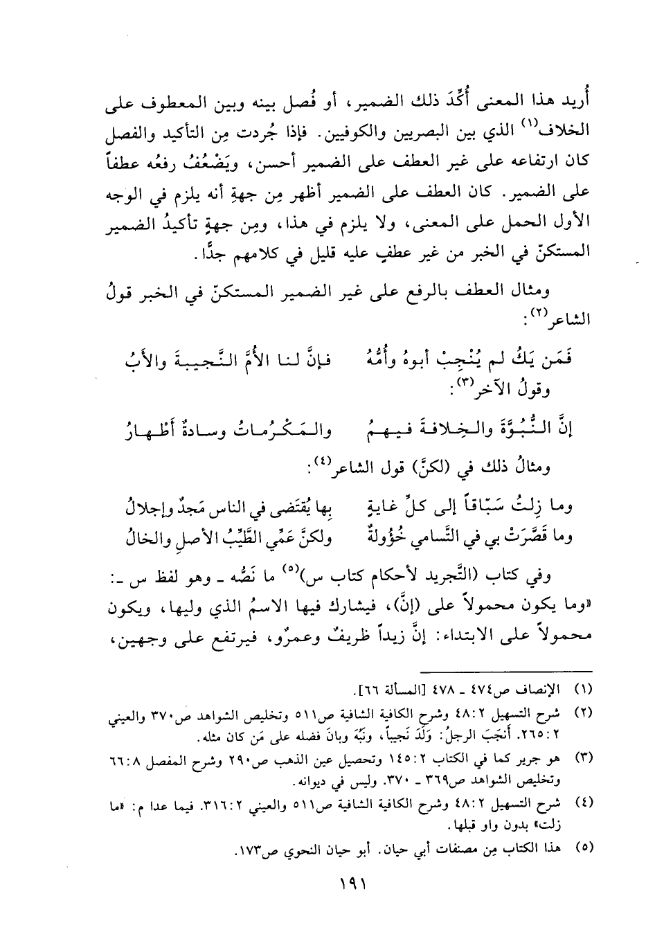 أريد هذا المعنى أكد ذلك الضمير، أو فصل بينه وبين المعطوف على الخلاف الذي بين البصريين والكوفيين. فإذا جردت من التأكيد والفصل كان ارتفاعه على غير العطف على الضمير أحسن، ويضعف رفعه عطفًا على الضمير. كان العطف على الضمير أظهر من جهة أنه يلزم في الوجه الأول الحمل على المعنى، ولا يلزم في هذا، ومن جهة تأكيد الضمير المستكن في الخبر من غير عطف عليه قليل في كلامهم جدًا.