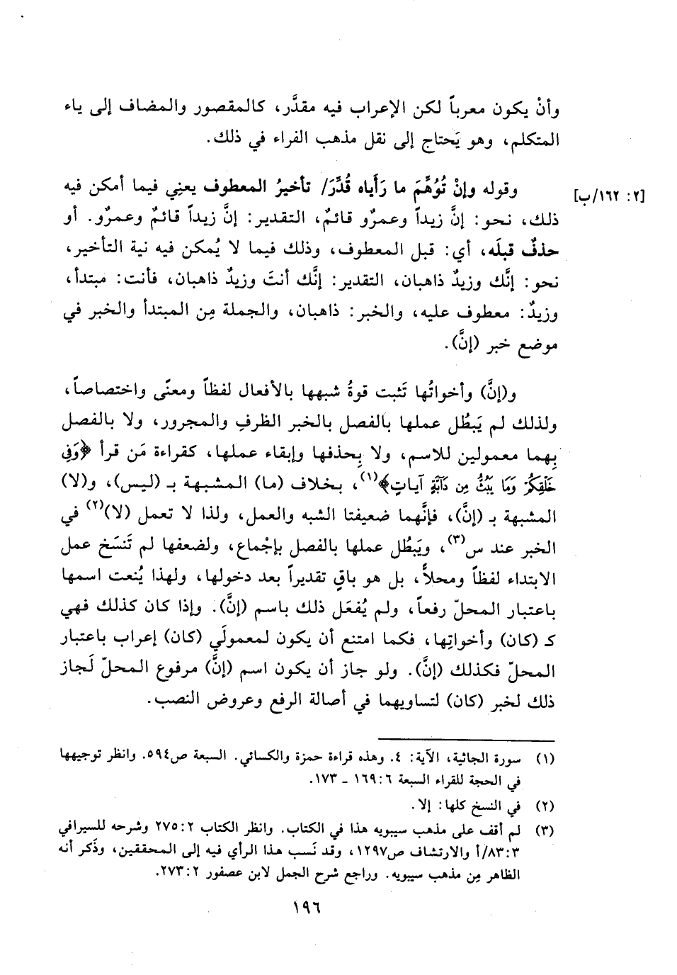 و (إن) وأخواتها تثبت قوة شبهها بالأفعال لفظًا ومعنى واختصاصًا، ولذلك لم يبطل عملها بالفصل بالخبر الظرف والمجرور، ولا بالفصل بهما معمولين للاسم، ولا بحذفها وإبقاء عملها، كقراءة من قرأ {وَفِي خَلْقِكُمْ وَمَا يَبُثُّ مِنْ دَابَّةٍ آَيَاتٌ}، بخلاف (ما) المشتبهة بـ (ليس)، و (لا) المشتبه بـ (إن)، فإنهما ضعيفتا الشبه والعمل، ولذا لا تعمل (لا) في الخبر عند س، ويبطل عملها بالفصل بإجماع، ولضعفها لم تنسخ عمل الابتداء لفظًا ومحلًا، بل هو باقٍ تقديرًا بعد دخولها، ولهذا ينعت اسمها باعتبار المحل رفعًا، ولم يفعل ذلك باسم (إن). وإذا كان كذلك فهي كـ (كان) وأخواتها، فكما امتنع أن يكون لمعمولي (كان) إعراب باعتبار المحل فكذلك (إن). ولو جاز أن يكون اسم (إن) مرفوع المحل لجاز ذلك لخبر (كان) لتساويهما في أصالة الرفع وعروض النصب.