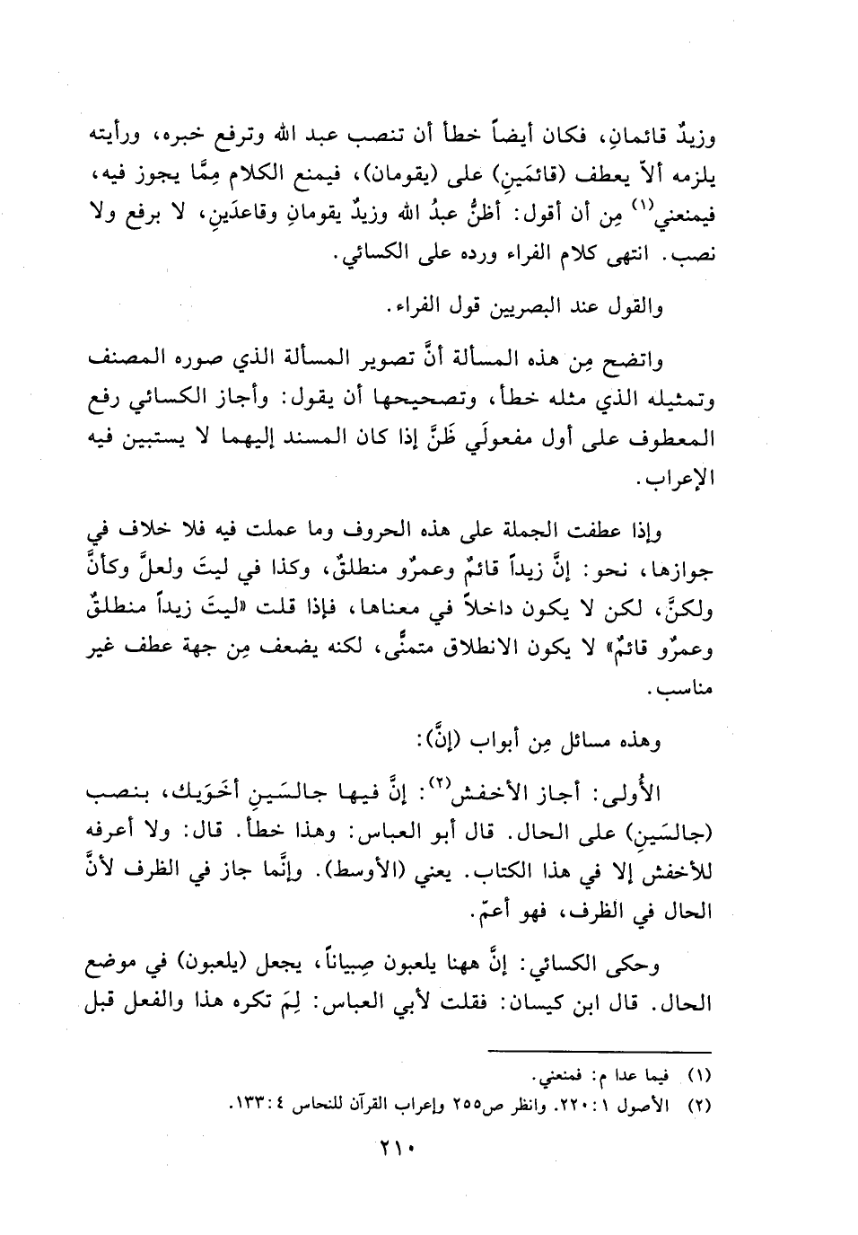 وزيد قائمان، فكان أيضًا خطأ أن تنصب عبد الله وترفع خبره، ورأيته يلزمه ألا يعطف (قائمين) على (يقومان)، فيمنع الكلام مما يجوز فيه، فيمنعني من أن أقول: أظن عبد الله وزيد يقومان وقاعدين، لا برفع ولا بنصب. انتهى كلام الفراء ورده على الكسائي.