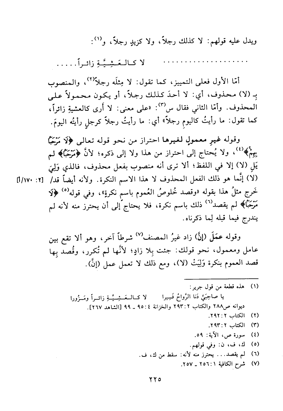 وقوله غير معمول لغيرها احتراز من نحز قوله تعالي {لا مَرْحَبًا بِهِمْ}، ولا يحتاج إلى احتراز من هذا ولا إلى ذكره؛ لأن {مَرْحَبًا} لم يل (لا) إلا في اللفظ؛ ألا ترى أنه منصوب بفعل محذوف، فالذي ولي (لا) غنما هو ذلك الفعل المحذوف لا هذا الاسم النكرة. ولأنه أيضا قد/خرج مثل هذا بقوله"وقصد خلوص العموم باسم نكرة"، وفي قوله {لا مَرْحَبًا} لم يقصد ذلك باسم نكرة، فلا يحتاج على أن يحترز منه لأنه لم يندرج فيما قبله لما ذكرناه.