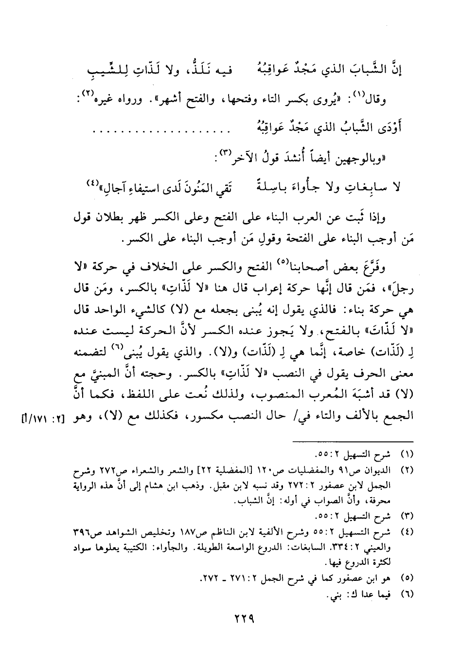 وفرع بعض أصحابنا الفتح والكسر علي الخلاف في حركة" لا رجل"، فمن قال إنها حركة إعراب قال هنا"لا لذات" بالكسر، ومن قال هي حركة بناء: فالذي يقول إنه يبنى بجعله مع (لا) كالشيء الواحد قال"لا لذات" بالفتح، ولا يجوز عنده الكسر لأن الحركة ليست عنده لـ (لذات) خاصة، إنما هي لـ (لذات) و (لا). والذي يقول يبني لتضمنه معنى الحرف يقول في النصب"لا لذات" بالكسر. وحجته إن المبنى مع (لا) قد أشبه المعرب المنصوب، ولذلك نعت علي اللفظ، فكما الجمع بالألف والتاء في/حال النصب مكسور، فكذلك مع (لا)، وهو