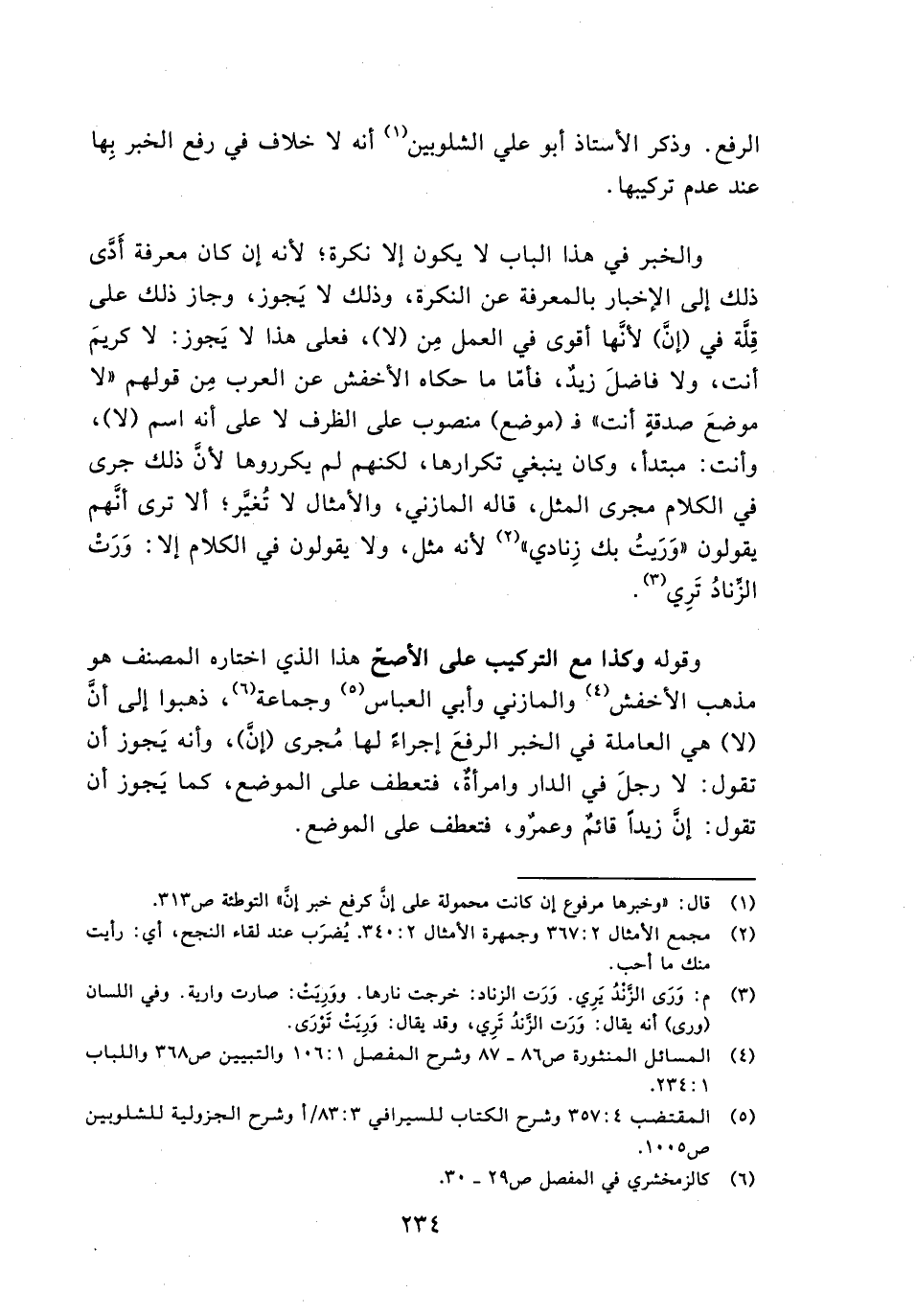 والخبر في هذا الباب لا يكون إلا نكرة؛ لأنه إن كان معرفة أدى ذلك إلى الإخبار بالمعرفة عن النكرة، وذلك لا يجوز، وجاز ذلك على قلة في (إن) لأنها أقوى في العمل من (لا)، فعلى هذا لا يجوز: لا كريم أنت، ولا فاضل زيد، فأما ما حكاه الأخفش عن العرب من قولهم "لا موضع صدقة أنت" فـ (موضع) منصوب على الظرف لا على أنه اسم (لا)، وأنت: مبتدأ، وكان ينبغي تكرارها، لكنهم لم يكرروها لأن ذلك جرى في الكلام مجرى المثل، قاله المازني، والأمثال لا تغير؛ ألا ترى أنهم يقولون "وريت بك زنادي" لأنه مثل، ولا يقولون في الكلام إلا: ورت الزناد تري.