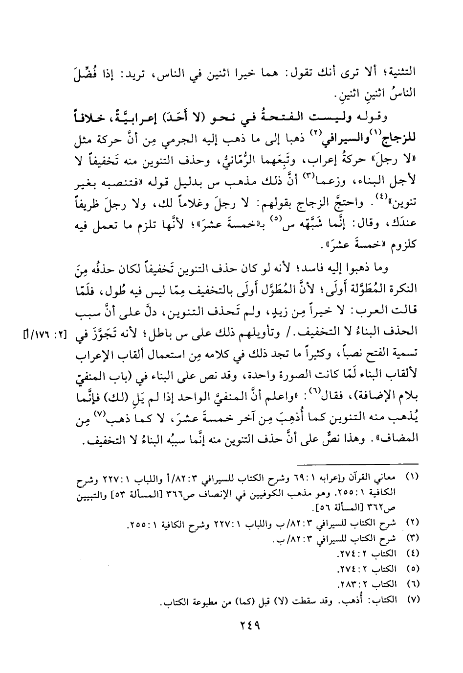 وما ذهبوا إليه فاسد؛ لأنه لو كان حذف التنوين تخفيفًا لكان حذفه من النكرة المطولة أولى؛ لأن المطول أولى بالتخفيف مما ليس فيه طول، فلما قالت العرب: ل خيرًا من زيد، ولم تحذف التنوين، دل على أن سبب الحذف البناء لا التخفيف./ وتأويلهم ذلك على س باطل؛ لأنه تجوز في تسمية الفتح نصبًا، وكثيرًا ما تجد ذلك في كلامه من استعمال ألقاب الإعراب لألقاب البناء لما كانت الصورة واحدة، وقد نص على البناء في (باب المنفي بلام الإضافة)، فقال: "وأعلم أن المنفي الواحد إذا لك يل (لك) فإنما يذهب منه التنوين كما أذهب من آخر خمسة عشر، لا كما ذهب من المضاف". وهذا نص على أن حذف التنوين منه إنما سببه البناء لا التخفيف.