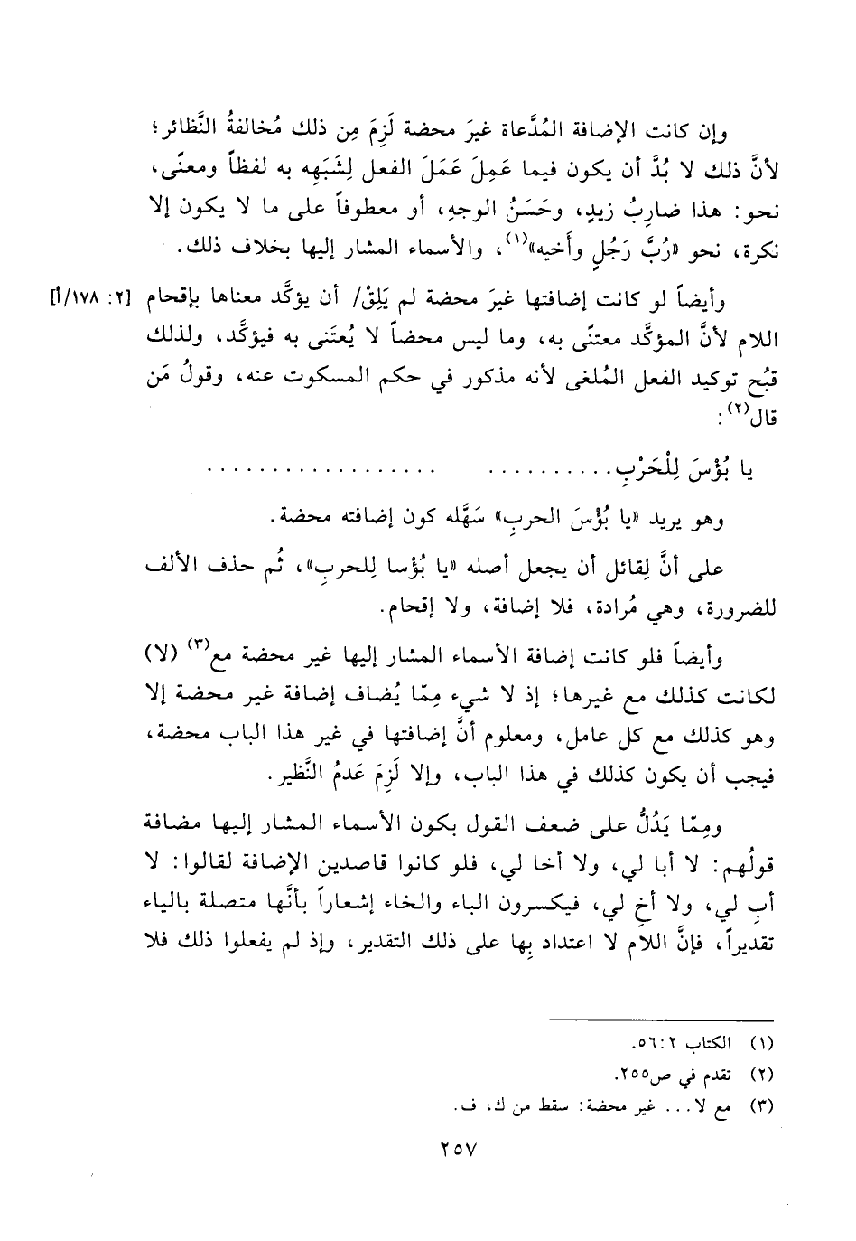 وإن كانت الإضافة المدعاة غير محضة لزم من ذلك مخالفة النظائر؛ لأن ذلك لا بد أن يكون فيما عمل عمل الفعل لشبهه به لفظًا ومعنى، نحو: هذا ضارب زيد، وحسن الوجه، أو معطوفًا على ما لا يكون إلا نكرة، نحو "رب رجل وأخيه"، والأسماء المشار إليها بخلاف ذلك.