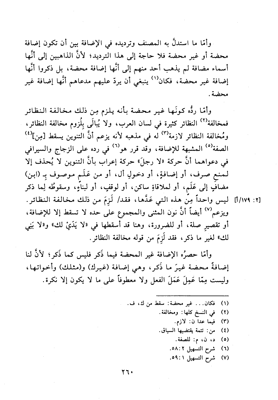 وأما رده كونها غير محضة بأنه يلزم من ذلك مخالفة النظائر فمخالفة النظائر كثيرة في لسان العرب، ولا يبالى بلزوم مخالفة النظائر، ومخالفة النظائر لازمة له في مذهبه لأنه يزعم أن التنوين يسقط [من] الصفة المشبهة للإضافة، وقد قرر هو في رده على الزجاج والسيرافي في دعواهما أن حركة "لا رجل" حركة إعراب بأن التنوين لا يحذف إلا لمنع صرف، أو إضافة، أو دخول أل، أو من علم موصوف بـ (ابن) مضاف إلى علم، أو لملاقاة ساكن، أو لوقف، أو لبناء، وسقوطه لما ذكر ليس واحدًا من هذه التي عدها، فقد/ لزم من ذلك مخالفة النظائر. ويزعم أيضًا أن نون المثنى والمجموع على حده لا تسقط إلا للإضافة، أو تقصير صلة، أو للضرورة، وهنا قد أسقطها في "لا يدي لك" و"لا بني لك" لغير ما ذكر، فقد لزم من قوله مخالفة النظائر.