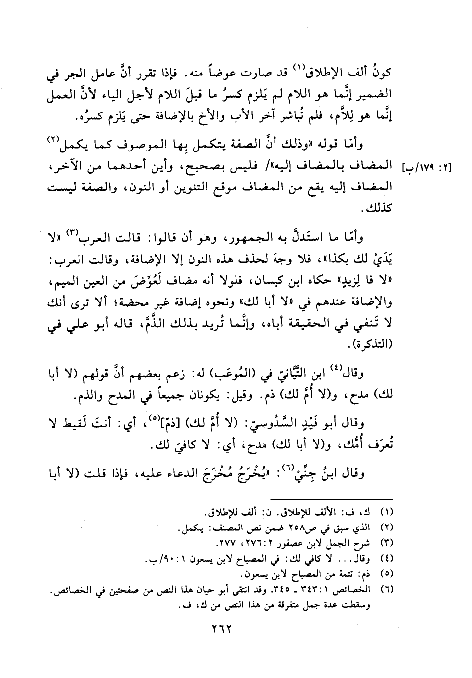 وأما ما استدل به الجمهور، وهو أن قالوا: قالت العرب "لا يدي لك بكذا"، فلا وجه لحذف هذه النون إلا الإضافة، وقالت العرب: " لا فا لزيدٍ" حكاه ابن كيسان، فلولا أنه مضاف لعوض من العين الميم، والإضافة عندهم في "لا أبا لك" ونحوه إضافة غير محضة؛ ألا ترى أنك لا تَنفي في الحقيقة أباه، وإنما تُريد بذلك الذم، قاله أبو علي في (التذكرة).