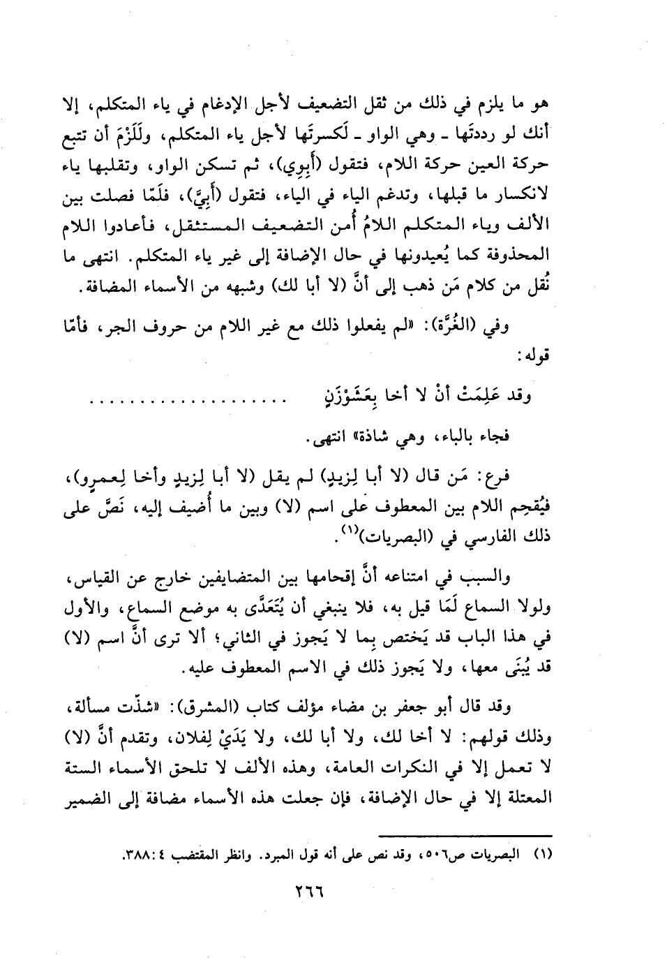 فرع: من قال (لا أبا لزيدٍ) لم يقل (لا أبا لزيدٍ وأخا لعمرٍو)، فيُقحم اللام بين المعطوف على اسم (لا) وبين ما أُضيف إليه، نص على ذلك الفارسي في (البصريات).