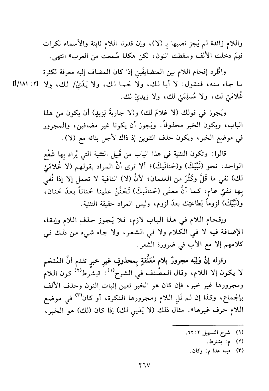 واطرد إقحام اللام بين المتضايفين إذا كان المضاف إليه معرفة لكثرة ما جاء منه، فتقول: لا أبا لك، ولا حما لك، ولا يدي/ لك، ولا غلامي لك، ولا مُسلمي لك، ولا زيدي لك.