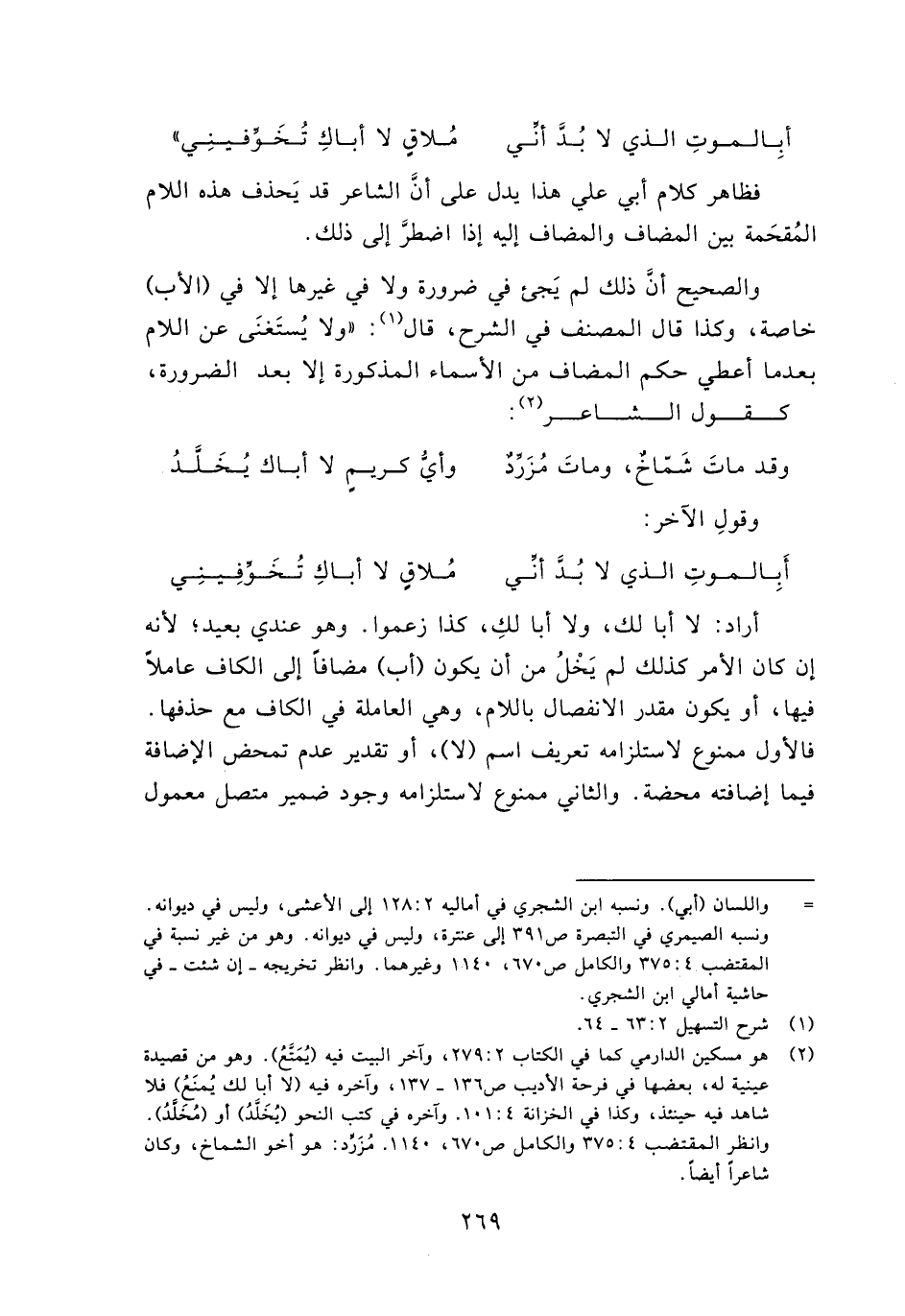 أراد: لا أبا لك، ولا أبا لك، كذا زعموا. وهو عندي بعيد؛ لأنه إن كان الأمر كذلك لم يخل من أن يكون (أب) مضافًا إلى الكاف عاملًا فيها، أو يكون مقدر الانفصال باللام، وهي العاملة في الكاف مع حذفها. فالأول ممنوع لاستلزامه تعريف اسم (لا)، أو تقدير عدم تمحض الإضافة فيما إضافته محضة. والثاني ممنوع لاستلزامه وجود ضمير متصل معمول