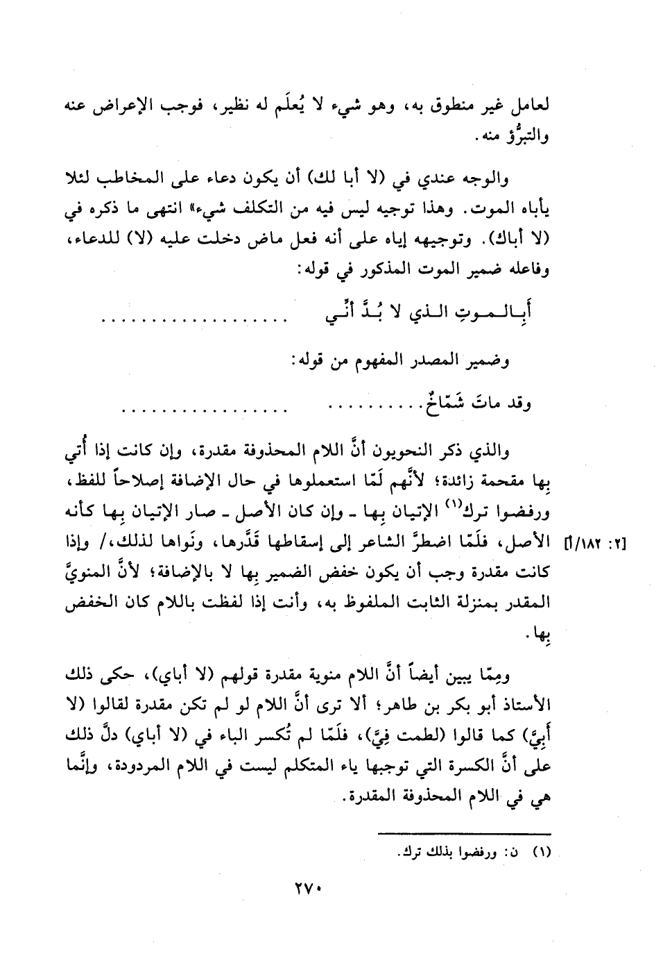 ومما يبين أيضًا أن اللام منوية مقدرة قولهم (لا أباي)، حكي ذلك الأستاذ أبو بكر بن طاهر؛ ألا ترى أن اللام لو لم تكن مقدرة لقالوا (لا أبي) كما قالوا (لطمت في)، فلما لم تُكسر الباء في (لا أباي) دل ذلك على أن الكسرة التي توجبها ياء المتكلم ليست في اللام المردودة، وإنما هي في اللام المحذوفة المقدرة.