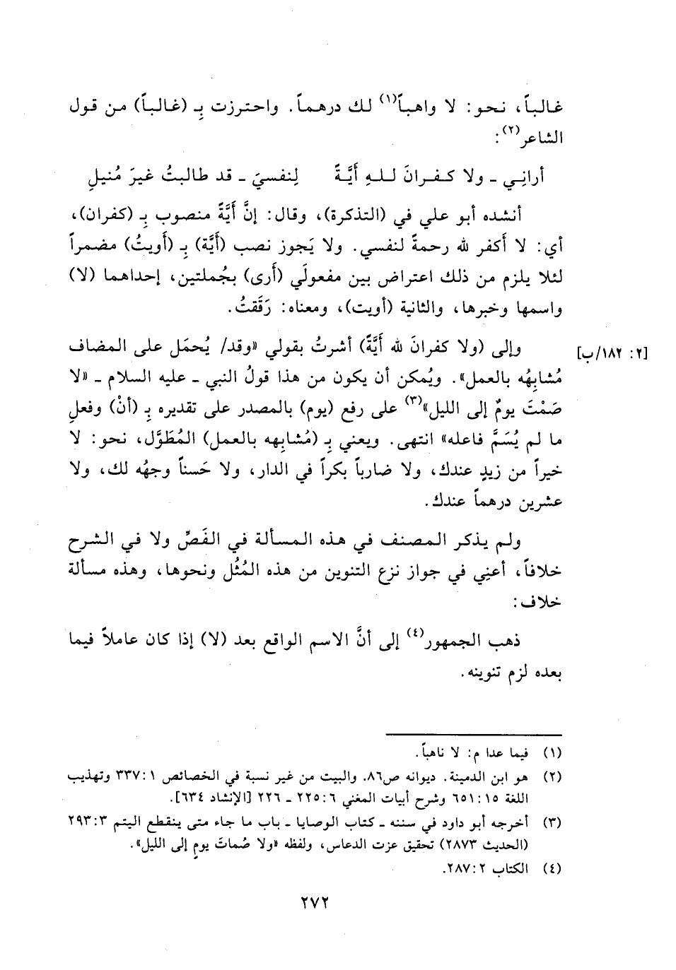 وإلى (ولا كفران لله أيةً) أشرت بقولي "وقد/ يُحمل على المضاف مُشابهه بالعمل". ويُمكن أن يكون من هذا قول النبي - عليه السلام - "لا صمت يومٌ إلى الليل" على رفع (يوم) بالمصدر على تقديره بـ (أن) وفعل ما لم يُسم فاعله" انتهى. ويعني بـ (مشابهه بالعمل) المُطول، نحو: لا خيرًا من زيدٍ عندك، ولا ضاربًا بكرًا في الدار، ولا حسنًا وجهه لك، ولا عشرين درهمًا عندك.