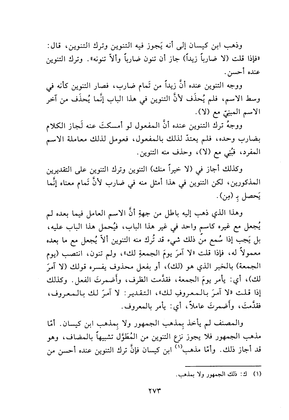 وذهب ابن كيسان إلى أنه يجوز فيه التنوين وترك التنوين، قال: "فإذا قلت (لا ضاربًا زيدًا) جاز أن تنون ضاربًا وألا تنونه". وترك التنوين عنده أحسن.