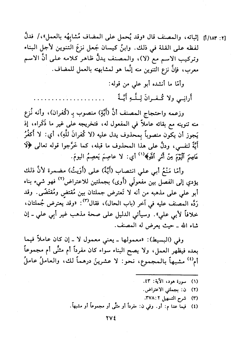 وأما منع أبي علي انتصاب (أيةً) على (أويت) مضمرة لأن ذلك يؤدي إلى الفصل بين مفعولي (أوي) بجملتين للاعتراض فهو شيء بناه أبو علي على مذهبه من أنه لا تعترض جملتان بين مقتضٍ ومقتضي. وقد رده المصنف عليه في آخر (باب الحال)، فقال: "وقد يعترض جُملتان، خلافًا لأبي علي). وسيأتي الدليل على صحة مذهب غير أبي علي - إن شاء الله - حيث يعرض له المصنف.