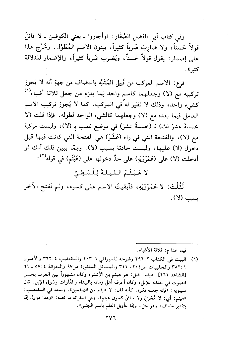 فرع: الاسم المركب من قبيل المُشبه بالمضاف من جهة أنه لا يجوز تركيبه مع (لا) وجعلهما كاسمٍ واحد لما يلزم من جعل ثلاثة أشياء كشيء واحد، وذلك لا نظير له في المركب، كما لا خمسة عشر لك) فـ (خمسة عشر) في موضع نصب بـ (لا)، وليست مركبة مع (لا)، والفتحة التي في راء (عشر) هي الفتحة التي كانت فيها قبل دخول (لا) عليها، وليست حادثة بسبب (لا). ومما يبين ذلك أنك لو أدخلت (لا) على (عمرويه) على حد دخولها على (هيثم) في قوله: