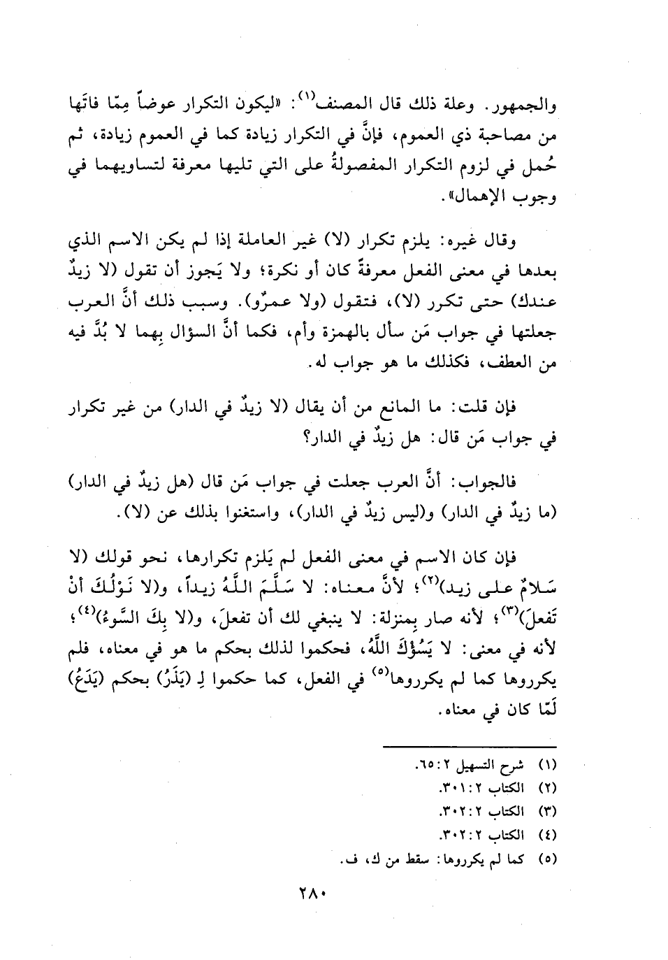 وقال غيره: يلزم تكرار (لا) غير العاملة إذا لم يكن الاسم الذي بعدها في معنى الفعل معرفةً كان أو نكرة؛ ولا يجوز أن تقول (لا زيدٌ عندك) حتى تكرر (لا)، فتقول (ولا عمروٌ). وسبب ذلك أن العرب جعلتها في جواب من سأل بالهمزة وأم، فكما أن السؤال بهما لابد فيه من العطف، فكذلك ما هو جواب له.